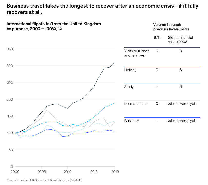 - Remote work and other flexible working arrangements are likely to remain in some form post-pandemic. People will take fewer corporate trips.